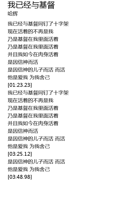 我已经与基督同钉十字架 现在活着的不再是我 乃是基督在我里面活着 并且我如今在肉身活着 是因信上帝的儿子而活 他是爱我 为我舍己 加拉太书